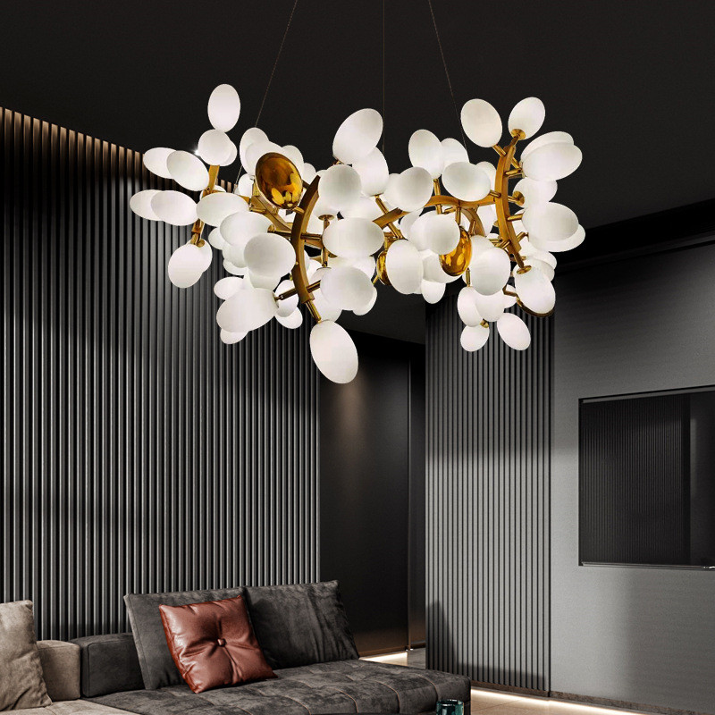 La lámpara de cristal de uva está hecha de material de vidrio de alta calidad, con brillo claro, transmisión de luz uniforme, seguridad y resistencia a explosiones, resistencia a altas temperaturas, arte biónico de uva,La fabricación de moldes con una textura clara y realista;