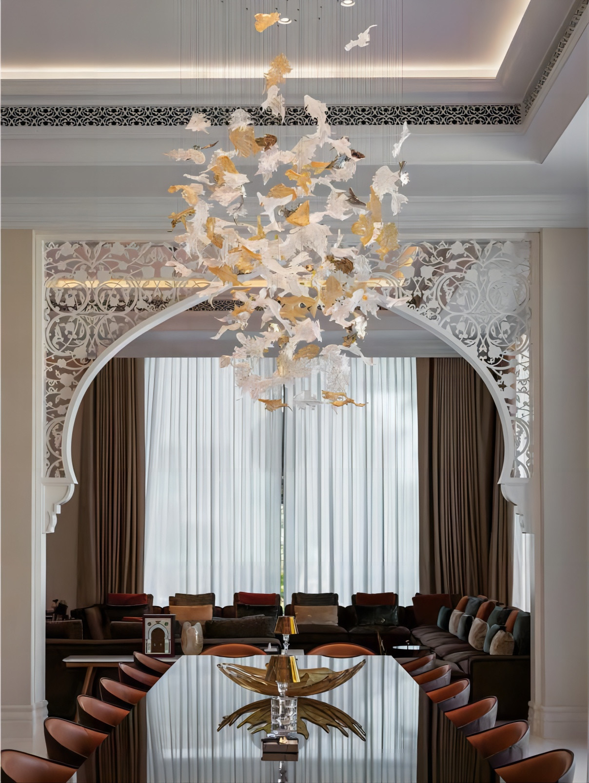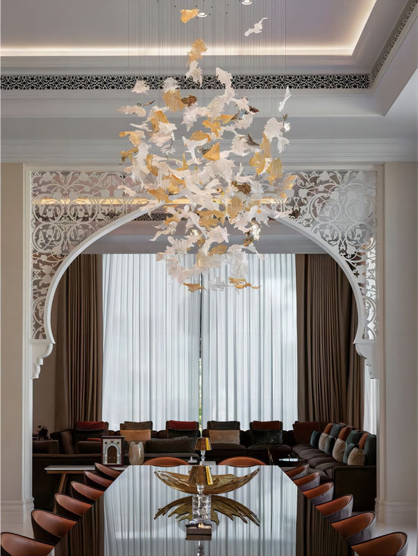 Este candelabro de hojas de arce personalizado está inspirado en las hojas de arce y combina la elegancia de las hojas de arce con la iluminación para crear una lámpara altamente artística y decorativa.Cada colgante de hojas de arce está hecho con una excelente artesanía de vidrioLa forma general de la lámpara de araña es elegante y única. Es a la vez un dispositivo de iluminación y una obra de arte.perfectamente integrado en el tema decorativo de la sala de banquetes.