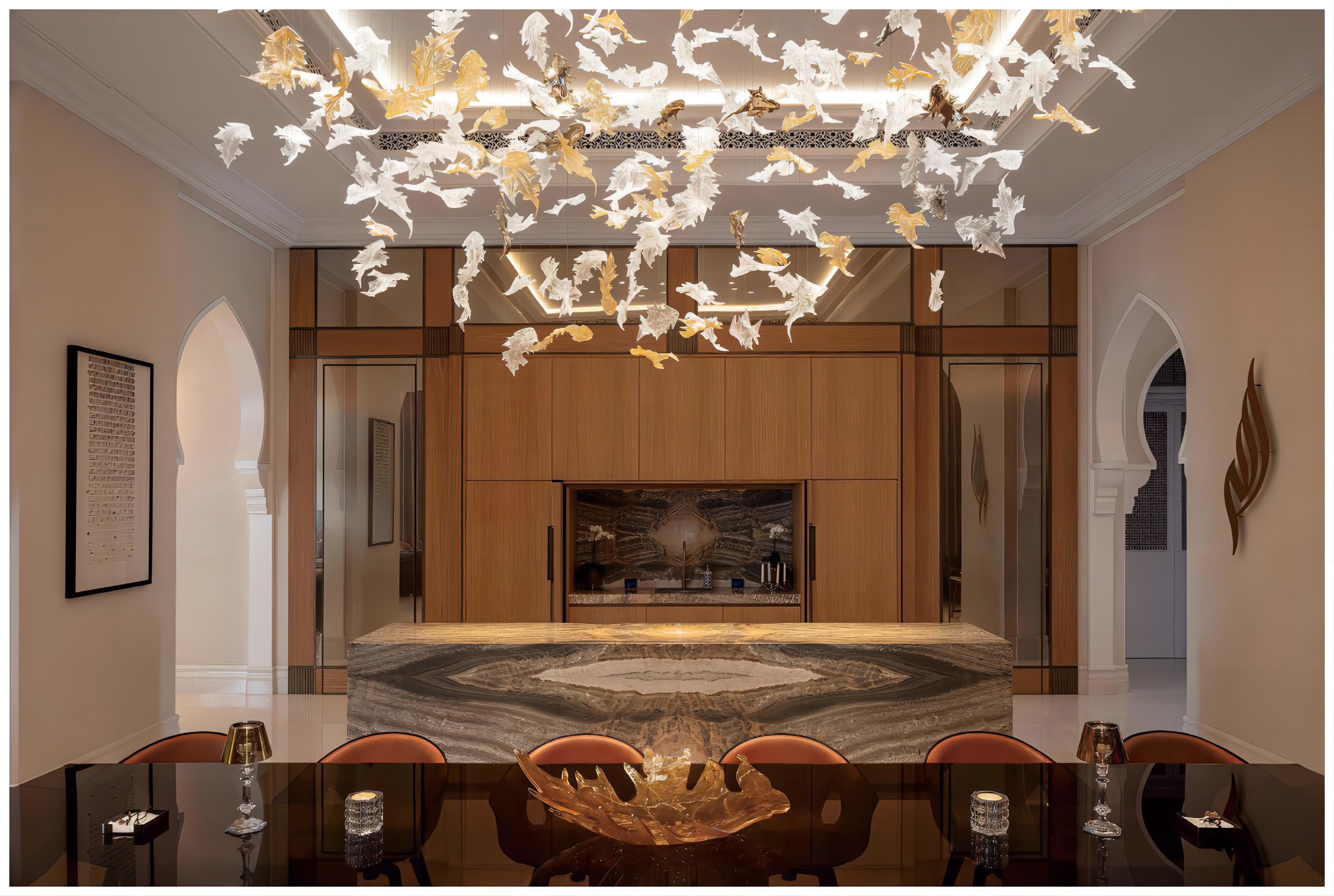 Decoración artística:Este candelabro de hojas de arce no es solo un dispositivo de iluminación, sino también una parte de la decoración artística de la sala de banquetes.El colgante de hojas de arce de vidrio emite un efecto encantador de luz y sombra bajo la luz, creando un ambiente romántico y cálido en la sala de banquetes y mejorando la calidad y el grado del ambiente general.